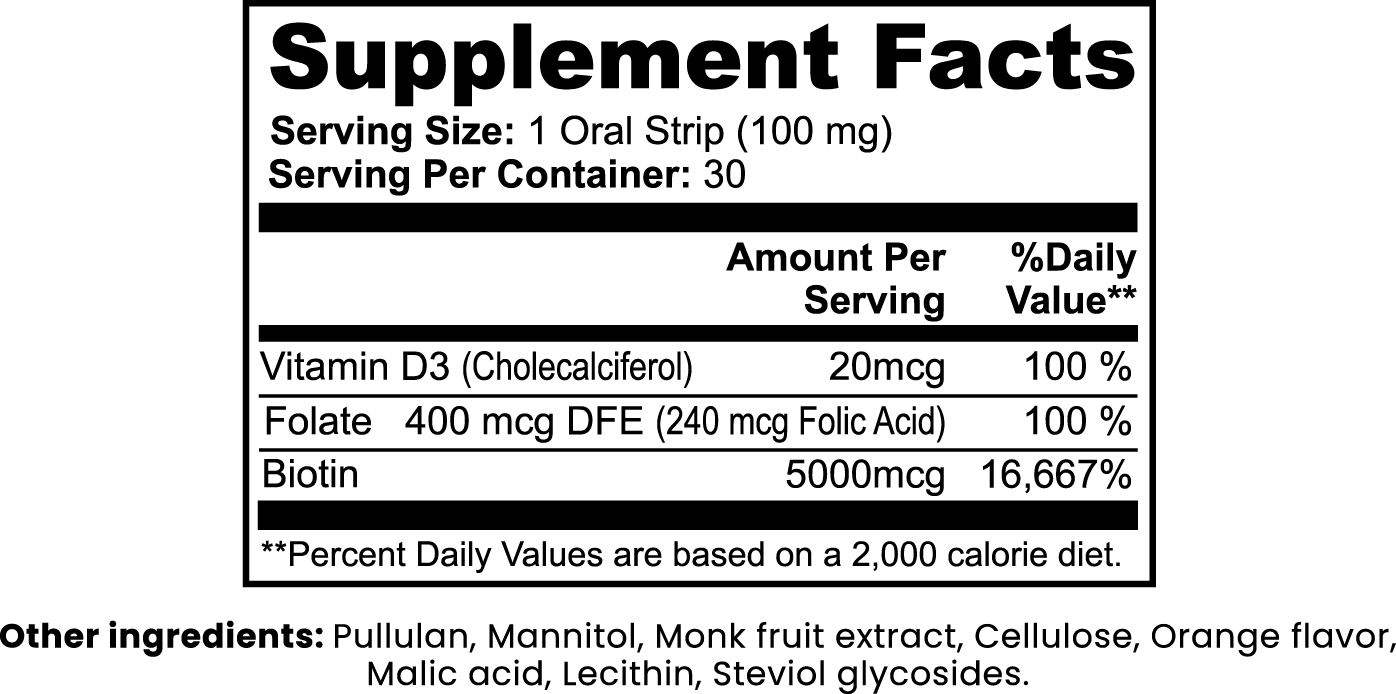 Ingredients: Biotin (5,000 mcg), Vitamin B9 (Folate) (400 mcg), Vitamin D3 (Cholecalciferol) (20 mcg), Pullulan, Cellulose, Mannitol, Monk Fruit Extract, Orange Flavor, Malic Acid, Lecithin, Steviol Glycosides